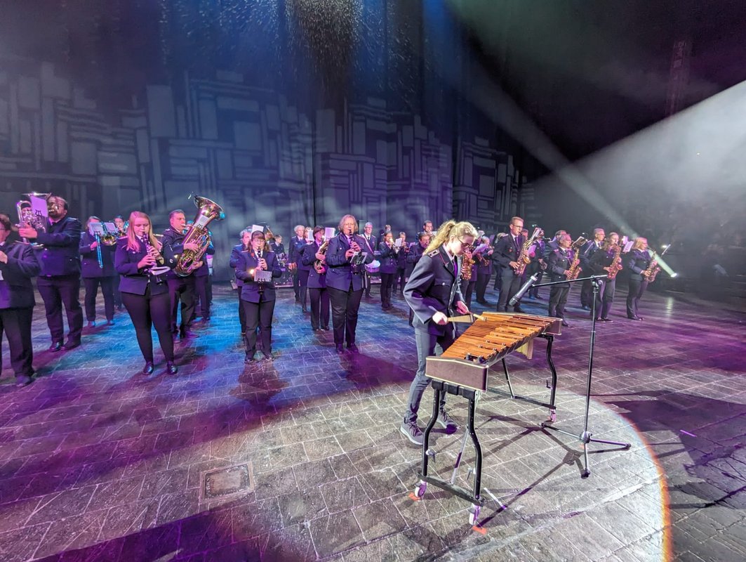 An zwei Sonntagen traf man sich gemeinsam in Nortorf, probte die gemeinsamen Stücke und vor allem die Choreografie für den Einmarsch in die Arena. Denn der Hauptteil des Auftritts der beiden Orchester, der traditionell direkt nach der Pause der Show angesetzt ist, besteht aus einem großen Einmarsch der Musiker. Der erfahrene musikalische Leiter des Eidertaler Orchesters Manfred Peter hatte für die beiden Bands eine Choreografie entworfen und auch gleich noch den passenden Marsch dazu arrangiert. Mit „Police Academy goes West“ kamen die knapp 50 Musikerinnen und Musiker in der Show imposant in die Arena einmarschiert. Im Anschluss daran beeindruckte die 16-jährige Schlagzeugerin aus dem Amt Nortorfer Land Lotta nicht nur den Moderator der Show, Ingo Oschmann, sondern auch die mehreren tausend Gäste der Show mit ihrem Xylophon-Solo „Erinnerungen an Zirkus Renz“. Zum Abschluss hatten die Feuerwehrmusikerinnen und -musiker noch ihren Sänger Matze mitgebracht, mit dem sie gemeinsam ein Medley mit Stücken des beliebten Sängers Udo Jürgens performten.