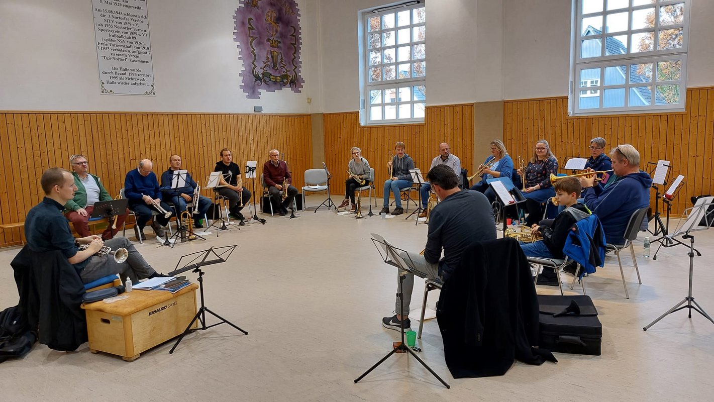 In diesem Rahmen fand am Samstag, den 18. November 2023 ein Workshop für Trompeten- und Flügelhornspielerinnen und -spieler in Nortorf statt. Dafür konnte mit dem Hamburger Trompeter, Komponisten und Bandleader Michel Schröder ein namhafter Profi als Ausbilder gewonnen werden. Mit 15 Teilnehmenden war die Gruppe voll besetzt. 5 Stunden lang wurden technische Finessen besprochen, gleich ausprobiert und eingeübt. So unterschiedlich wie die Schüler, vor Allem in Bezug auf Alter und Vorkenntnisse auch waren, so differenziert waren auch die Tipps und Tricks die Michel geben konnte. Am Ende des Tages waren sich alle Musikerinnen und Musiker einig: „Es hat sich gelohnt!“ Jeder und jede konnte etwas für sich und den eigenen Musikzug mitnehmen.